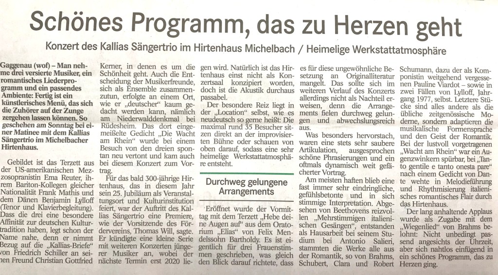 Das Kallias Sängertrio ist entstanden, als die drei Musikerfreunde – Ema Reuter (US), Frank Mathis (US) und Benjamin Lylloff (DK) – einen Ausflug durch den Rheingau machten und dabei am Niederwalddenkmal gegenüber Bingen eine Pause einlegten. Am Denkmal ist das Gedicht „Die Wacht am Rhein“ eingemeißelt. Spontan haben sie dazu ein Lied verfasst und gesungen. Inzwischen sind sie international bekannt und treten im Rahmen ihrer „BADEN KONZERTTOURNEE“ 2019 – CLARA SCHUMANN 200 – Vokalkonzerte anläßlich Clara Schumanns 200. Geburtstages an verschiedenen Standorten auf (www.kalliassaenger.de)