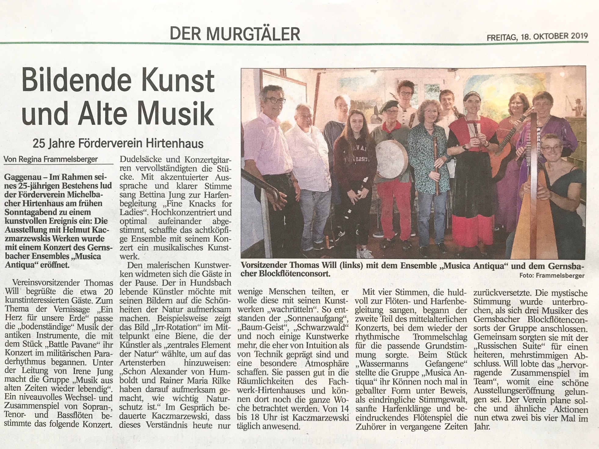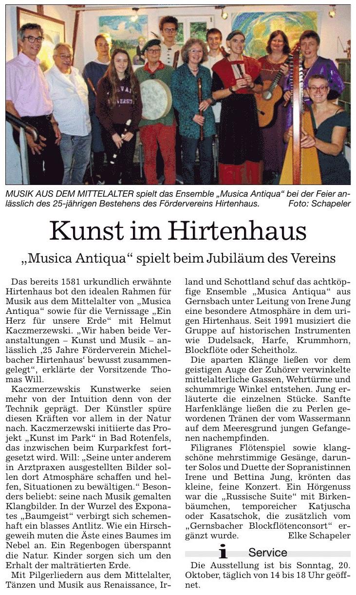 Am Sonntag, den 13. Oktober lädt der Förderverein Hirtenhaus im Rahmen seines 25-jährigen Bestehens zu einer Vernissage der Werke von Helmut Kaczmerzewski mit dem Motto „Ein Herz für unsere Erde“ und einem Konzert des Ensemble „Musica Antiqua“ ein.