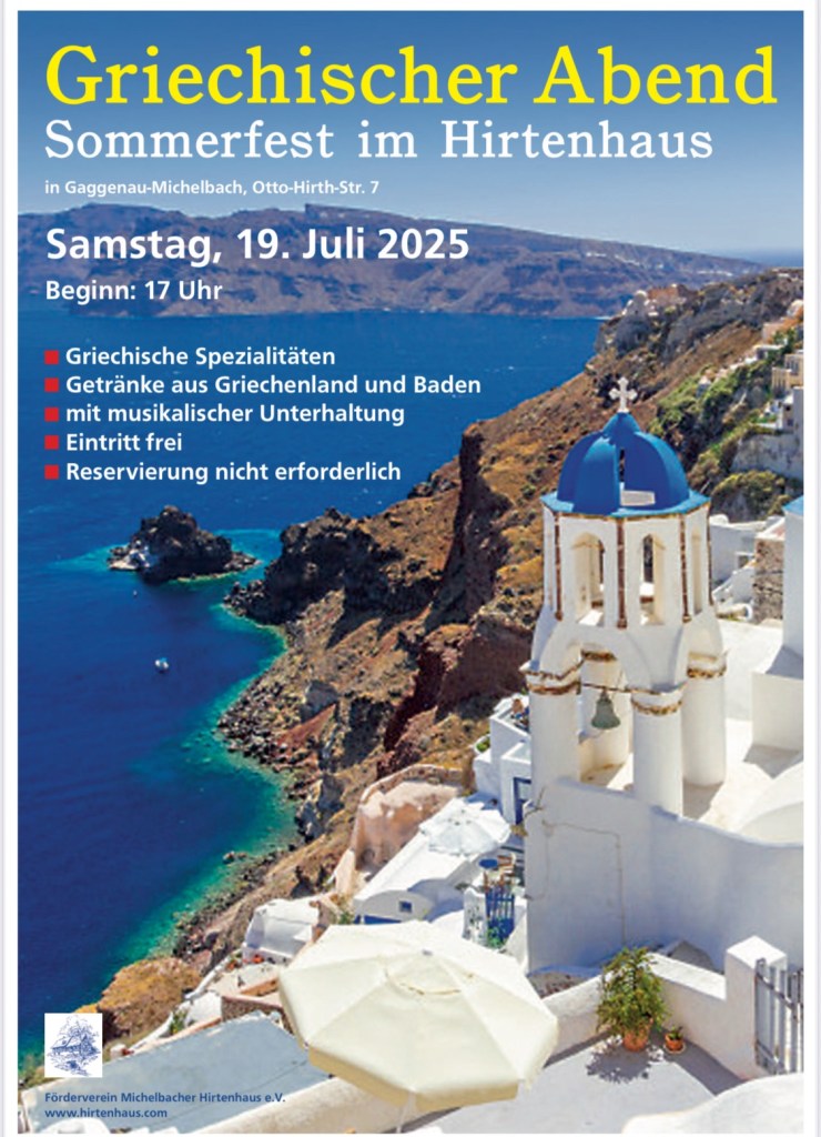 Gastfreundschaft, Geselligkeit, Genuss, Griechenland – das ist in diesem Jahr das Motto für das traditionelle Sommerfest im Hirtenhaus. Am Samstag, 19. Juli 2025, lädt der Förderverein Michelbacher Hirtenhaus auf die idyllische Terrasse über dem rauschenden Michelbach ein, Beginn ist um 17 Uhr.